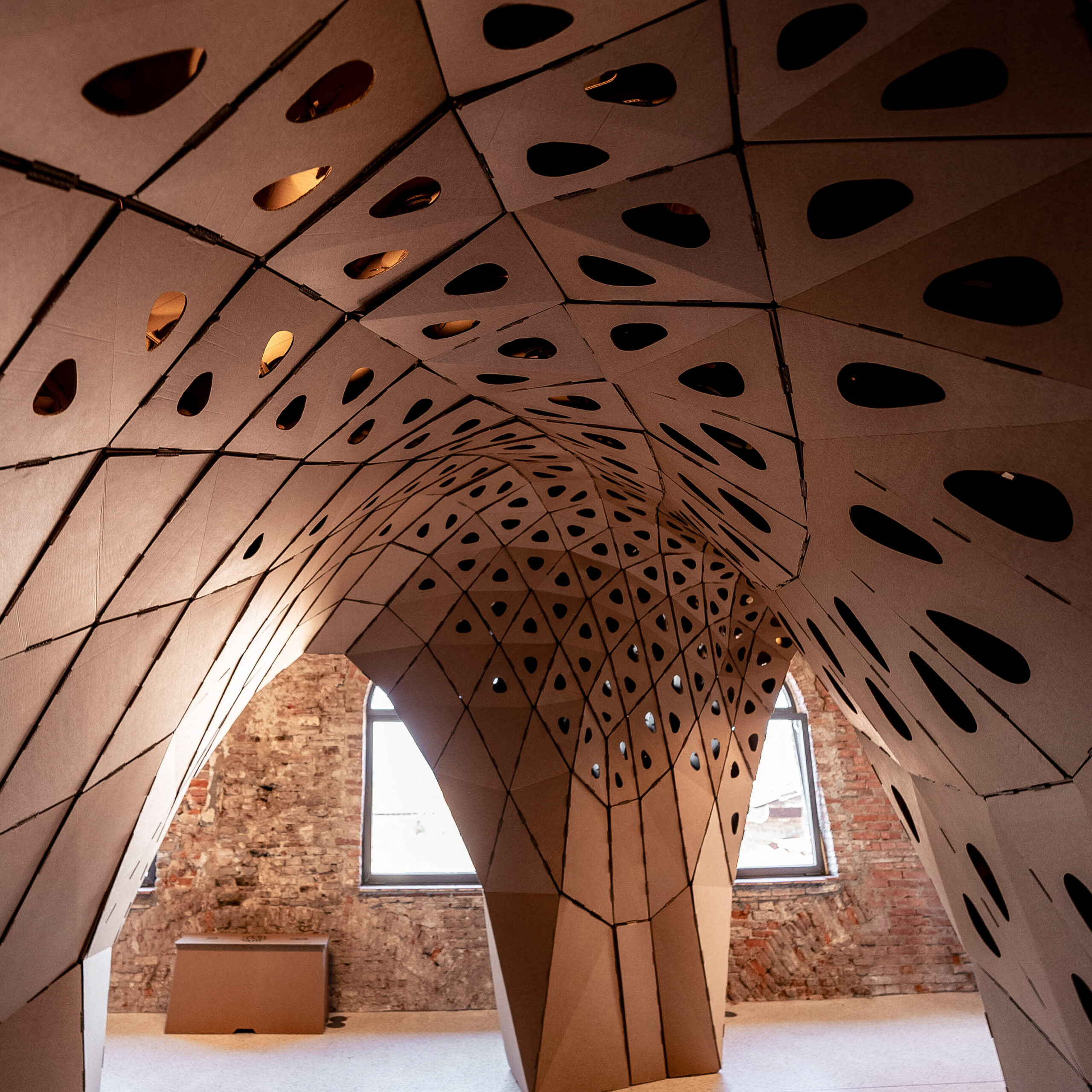 Posizionato all’interno di Palazzo Guinigi, il padiglione è un volume fluido e organico, realizzato interamente in cartone alveolare e assemblato senza colle o giunti complessi, grazie a un sistema di connessioni ad attrito. Un equilibrio tra stabilità e leggerezza, ottenuto attraverso strategie di fabbricazione digitale e ottimizzazione strutturale.