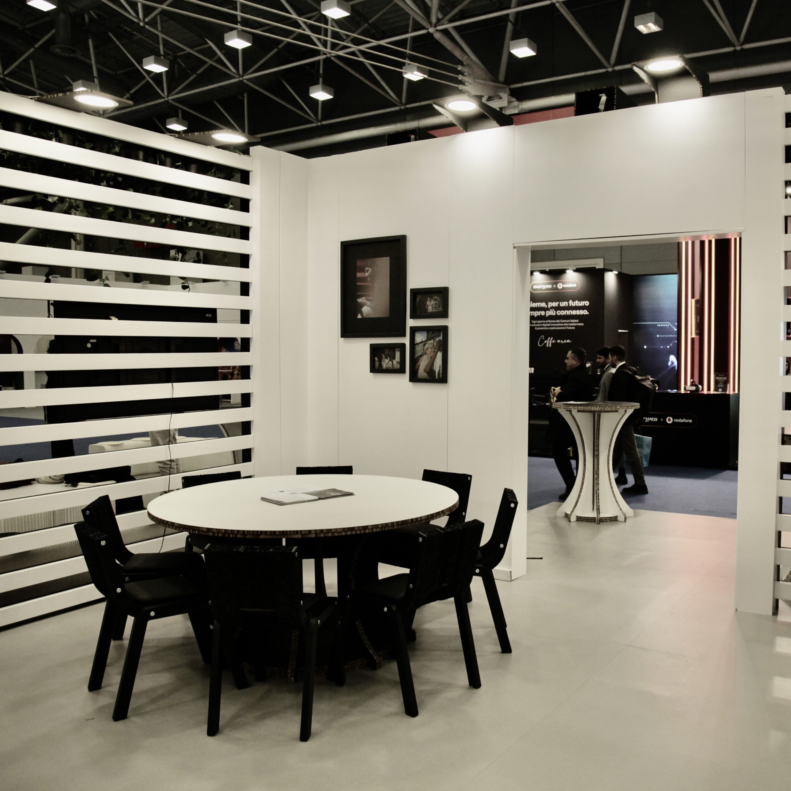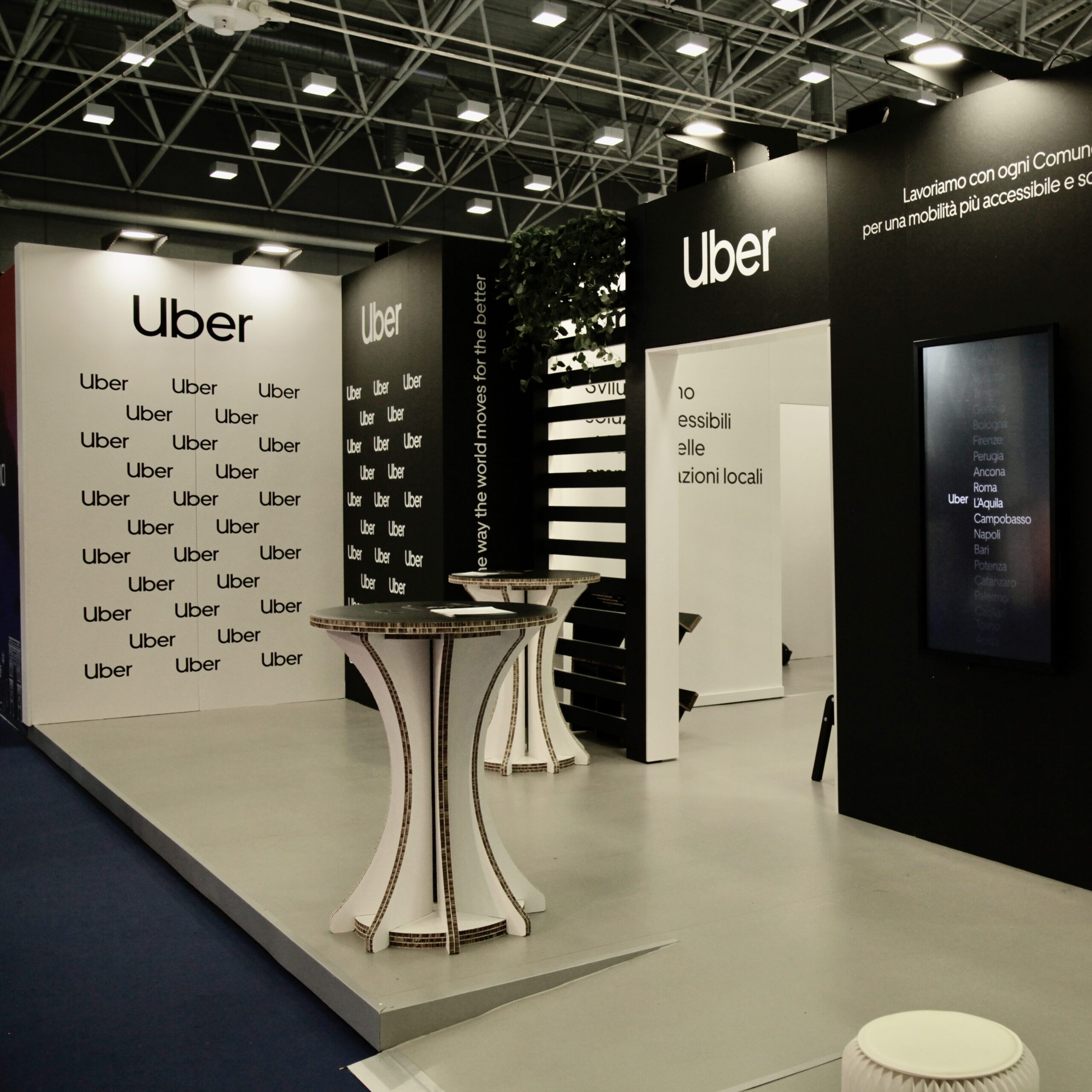 Lo stand si sviluppava sul contrasto tra bianco e nero, in coerenza con l’identità visiva di Uber. Le pareti nere presentavano grafiche informative a forte impatto, mentre pareti e arredi bianchi garantivano luminosità ed equilibrio. Le sedute modulari in carta a soffietto con cuscini neri, i tavolini scultorei in cartone e la meeting room interna completamente bianca contribuivano a un ambiente minimal e contemporaneo.