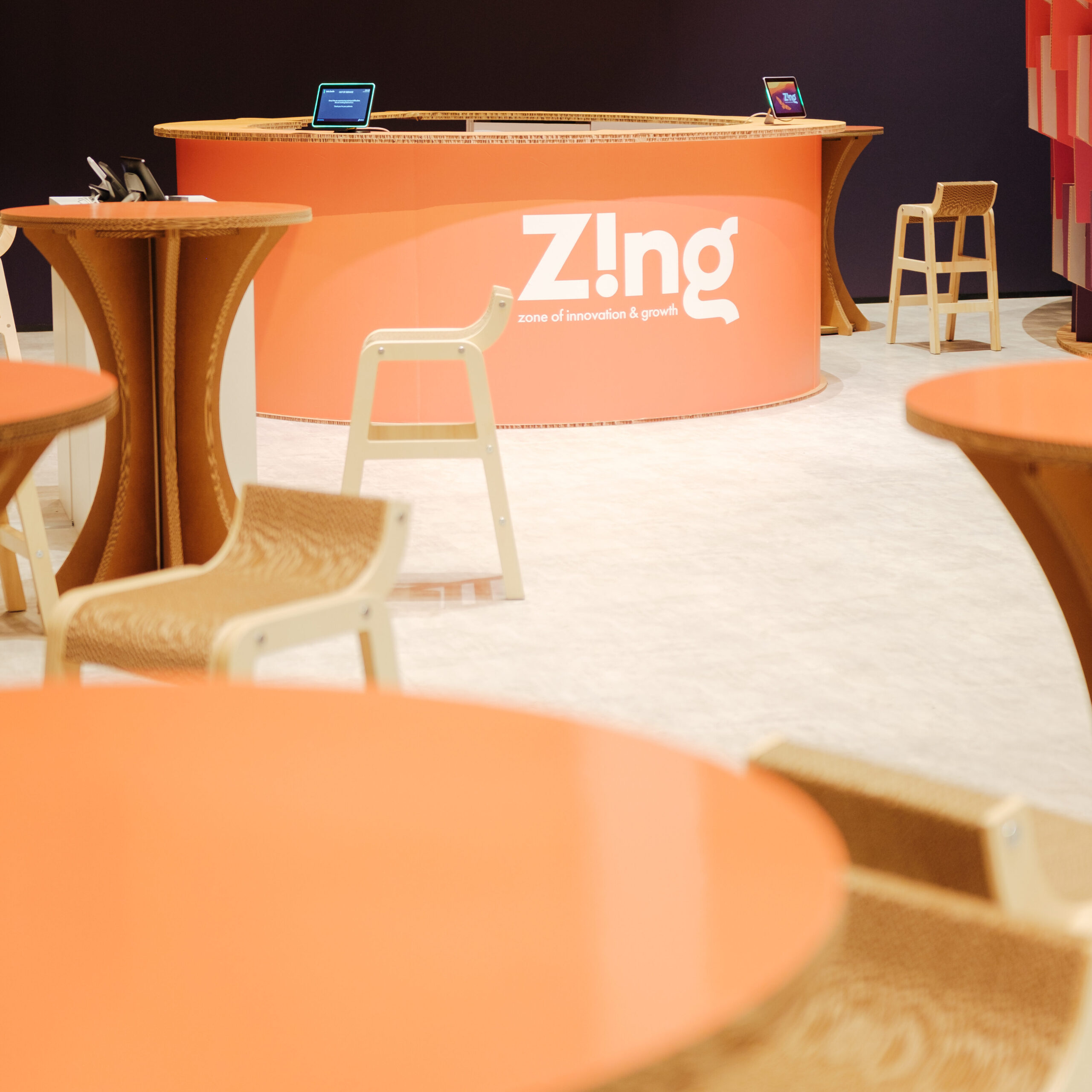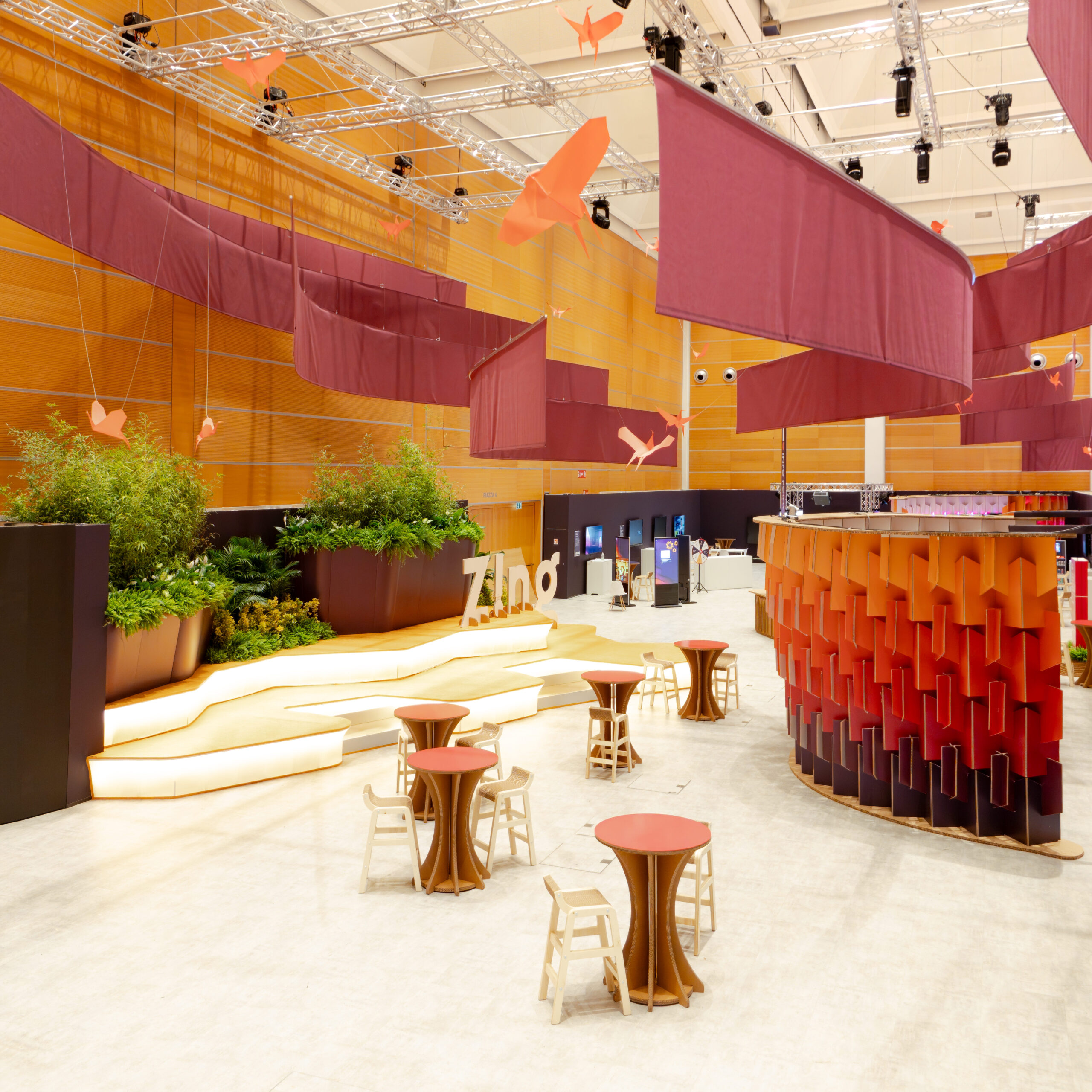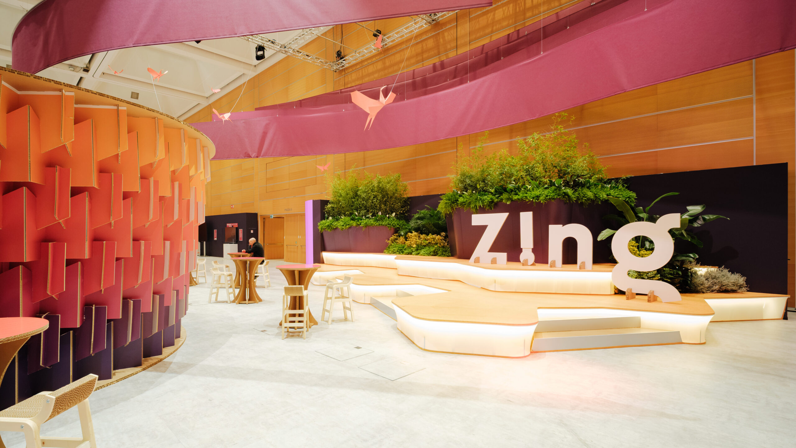 Il progetto riprende la brand identity sviluppata ad hoc per la convention Z!ng: una sfumatura continua dal viola all’arancio, applicata a tutte le superfici progettate, dagli arredi al grande appendimento sospeso.