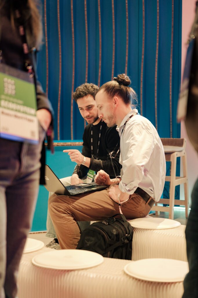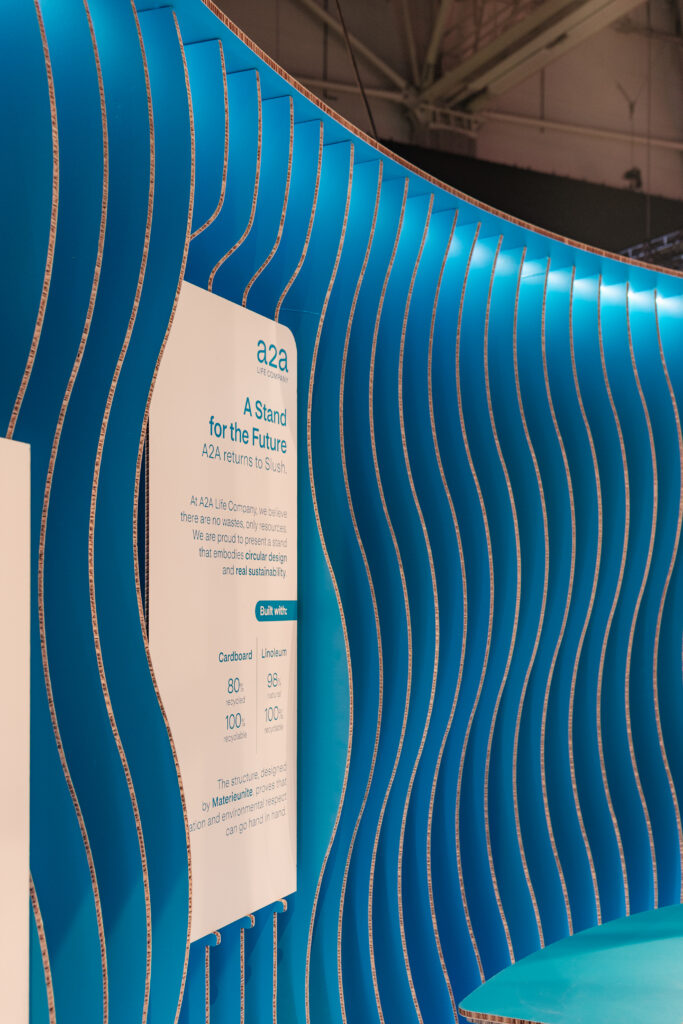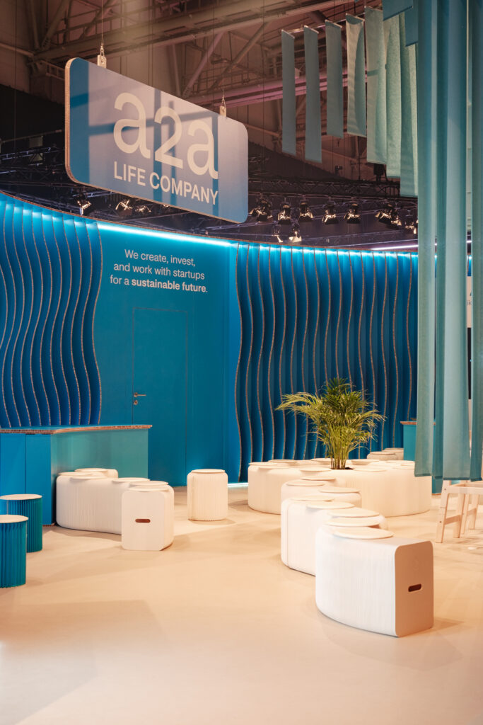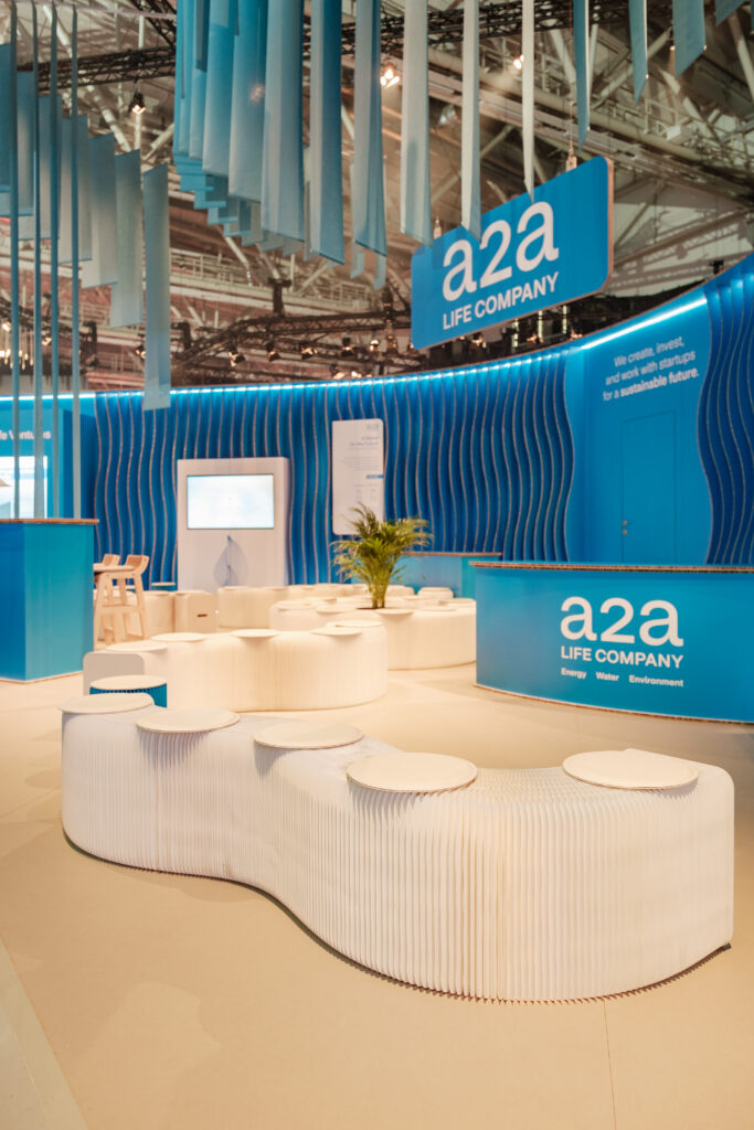 Il contrasto tra il blu saturo e le coste avana del cartone lasciate a vista racconta la natura duale dello stand: tecnologico e sostenibile, leggero ma solido, materico ma digitale.