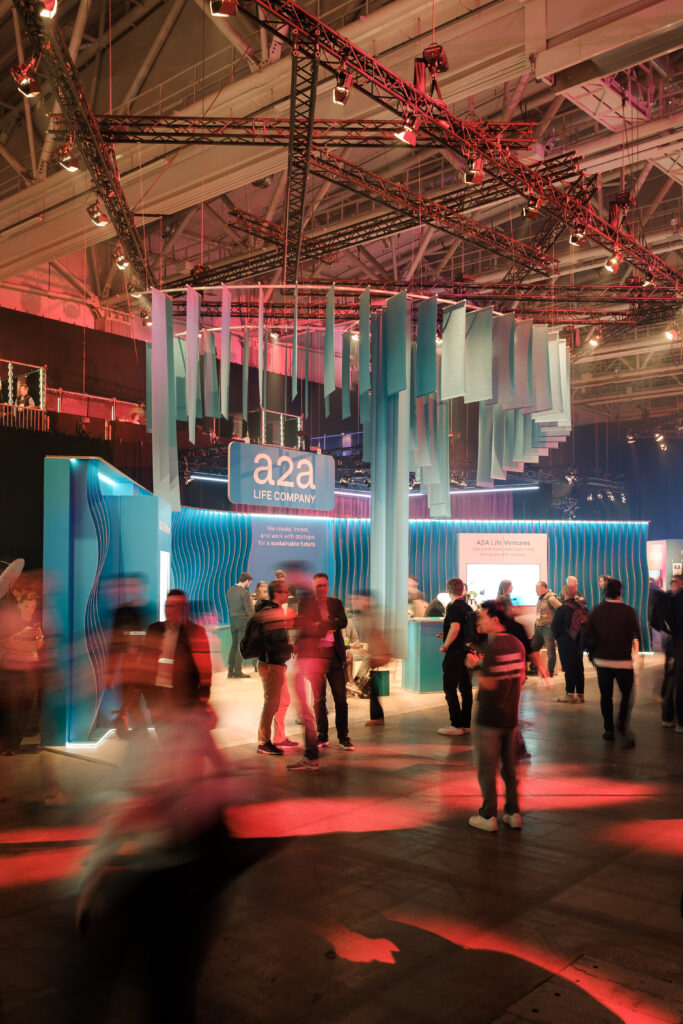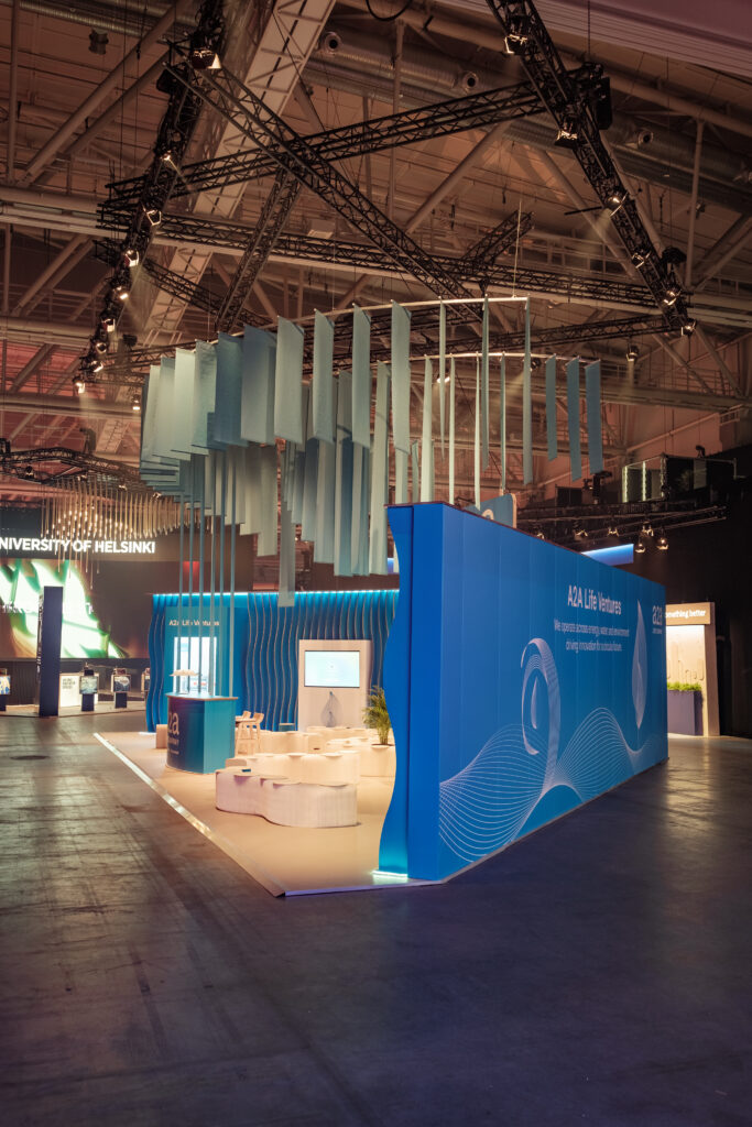 Situato in una posizione di rilievo, direttamente di fronte al main stage, lo spazio è progettato per essere immediatamente riconoscibile e diventare punto di riferimento in fiera.