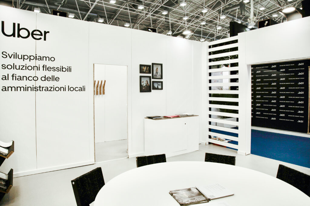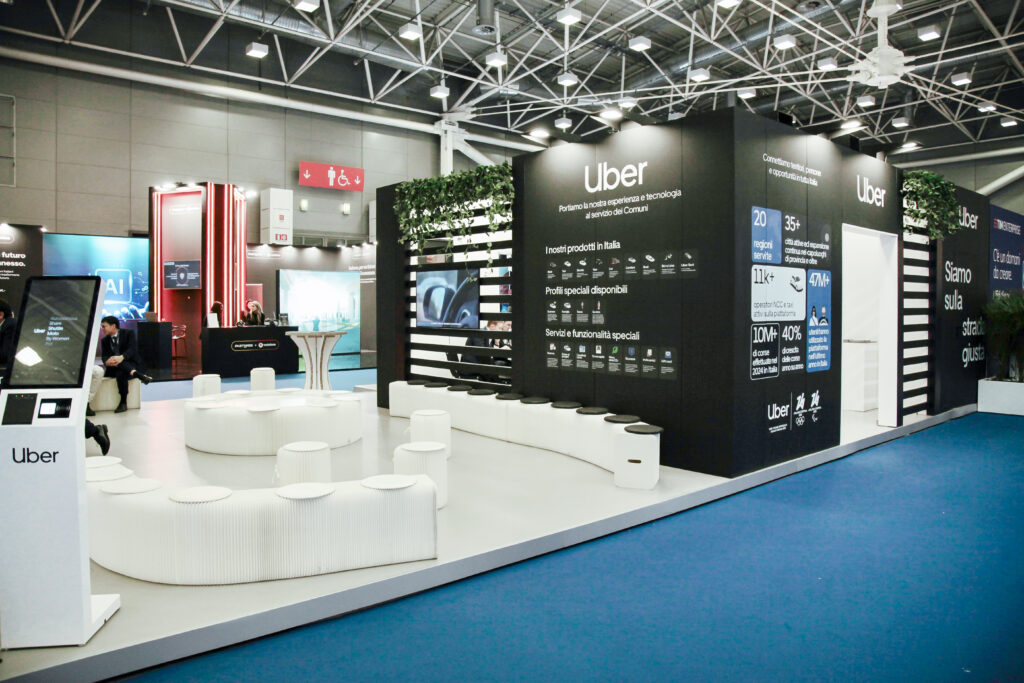 Stand interattivo che racconta il trasporto privato con schermi, geometrie e contrasti.