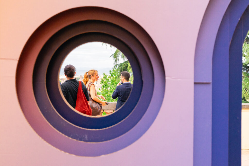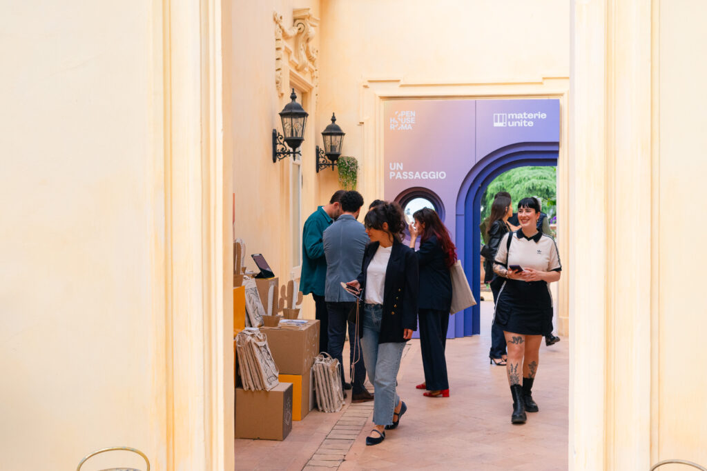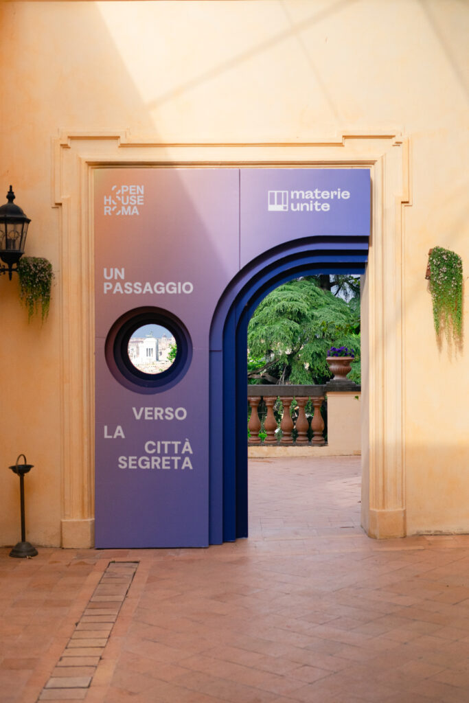 Il Portale in cartone riciclato invita a rallentare e osservare Villa Aurelia da nuove prospettive, un passaggio sostenibile e modulare che connette corpo e città: non una barriera ma un’apertura a nuove possibilità.