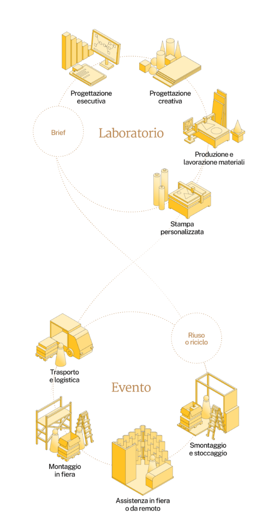 Innoviamo gli spazi, creando soluzioni espositive e arredi con basso impatto ambientale per eventi fieristici, exhibit e retail.